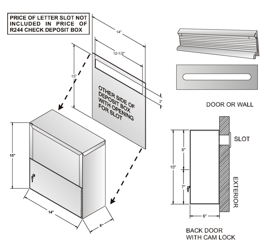 - Deposit box made of galvanized steel, primed and painted, silver grey, beige or black. Also available in polished stainless steel.